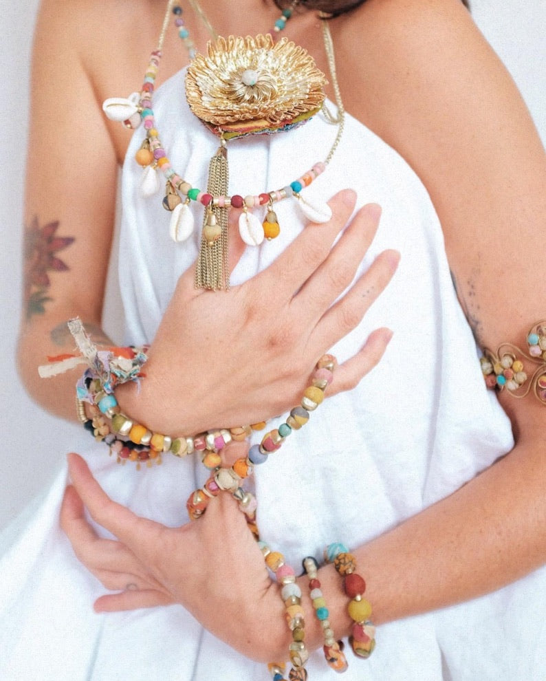 Våra Recycle-smycken skapas i ett kvinnoprojekt i Indien, där återvunnet tyg får fortsätta sin resa i form av handgjorda smycken. Ett långsamt och noggrant hantverk som samtidigt ger kvinnorna en egen inkomst och större frihet i vardagen.