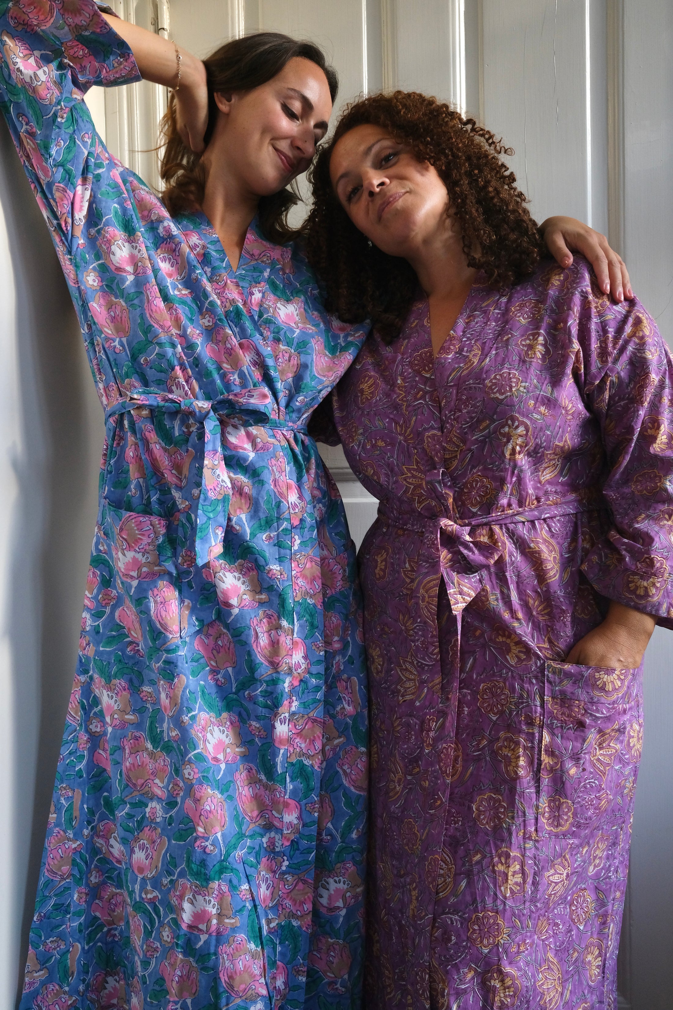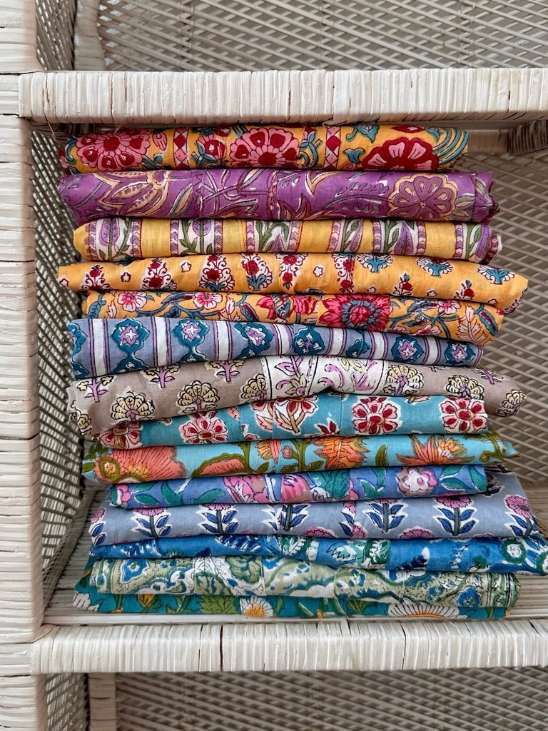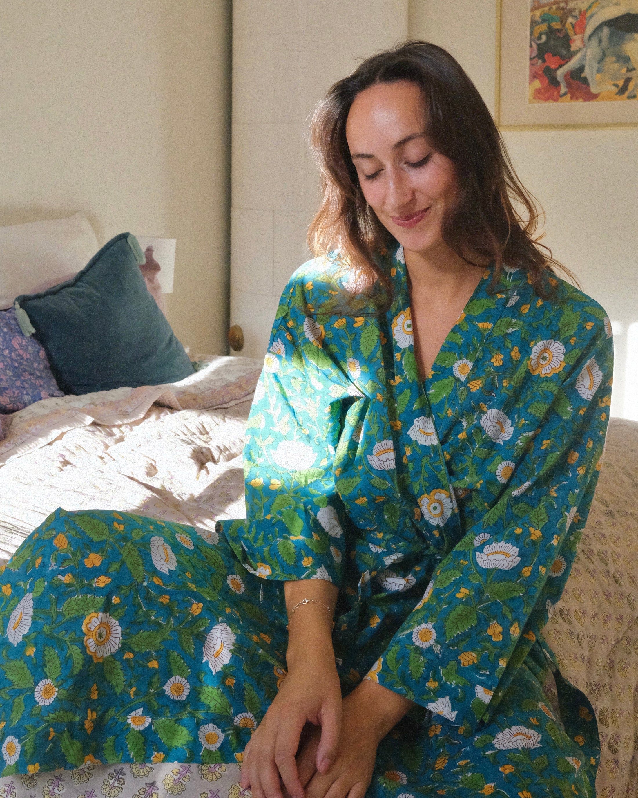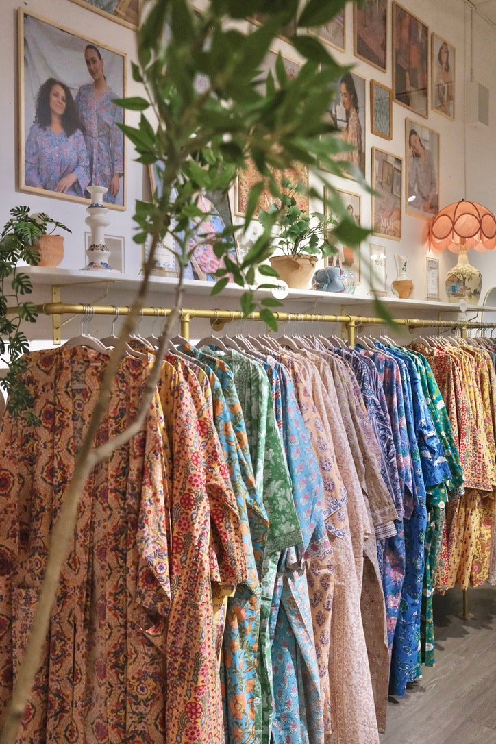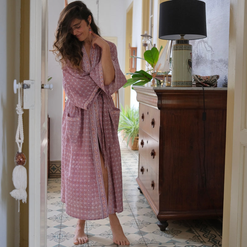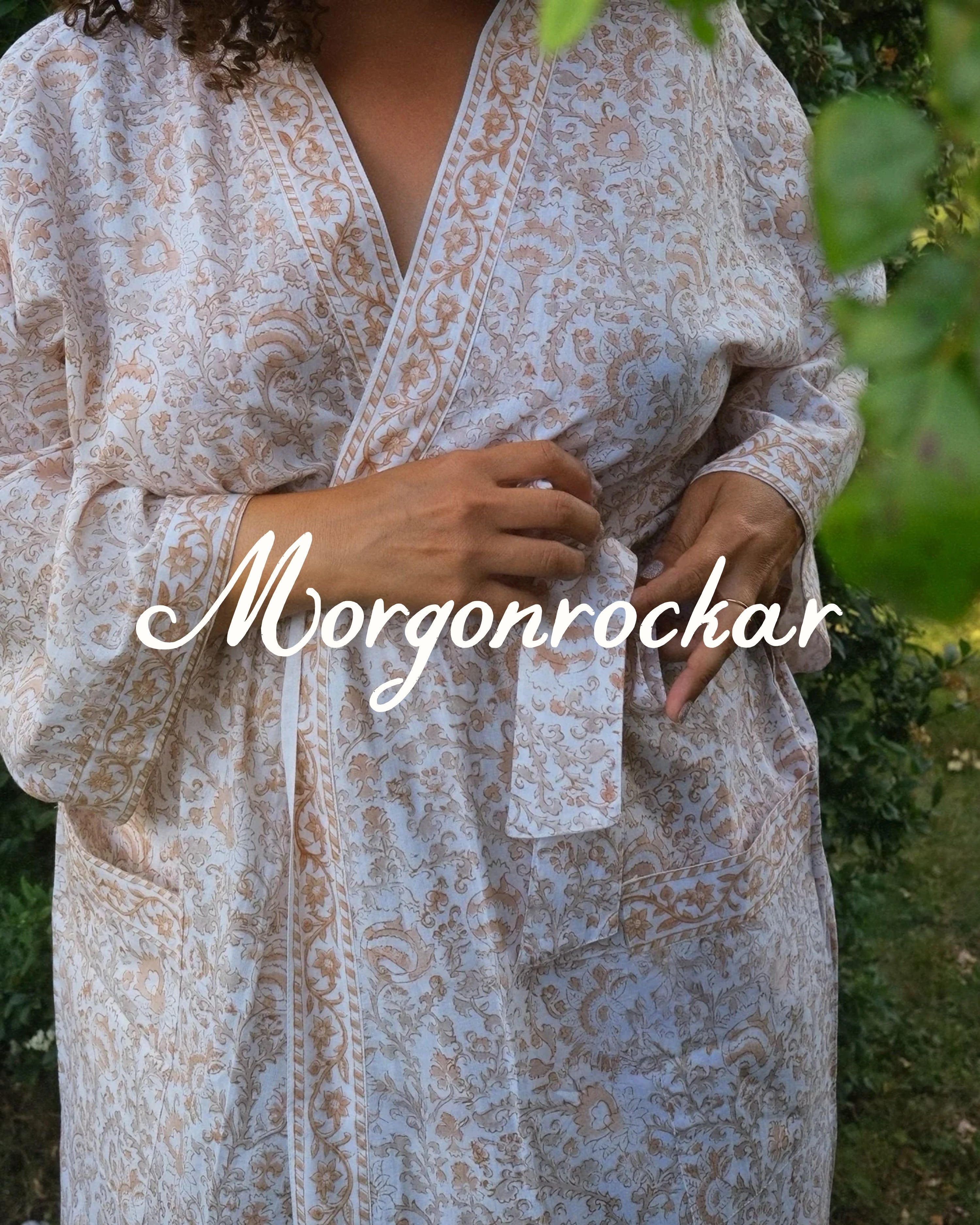 Upptäck våra morgonrockar i 100% bomull – handtryckta i färgstarka mönster från världens huvudstad för blocktryck: Jaipur.