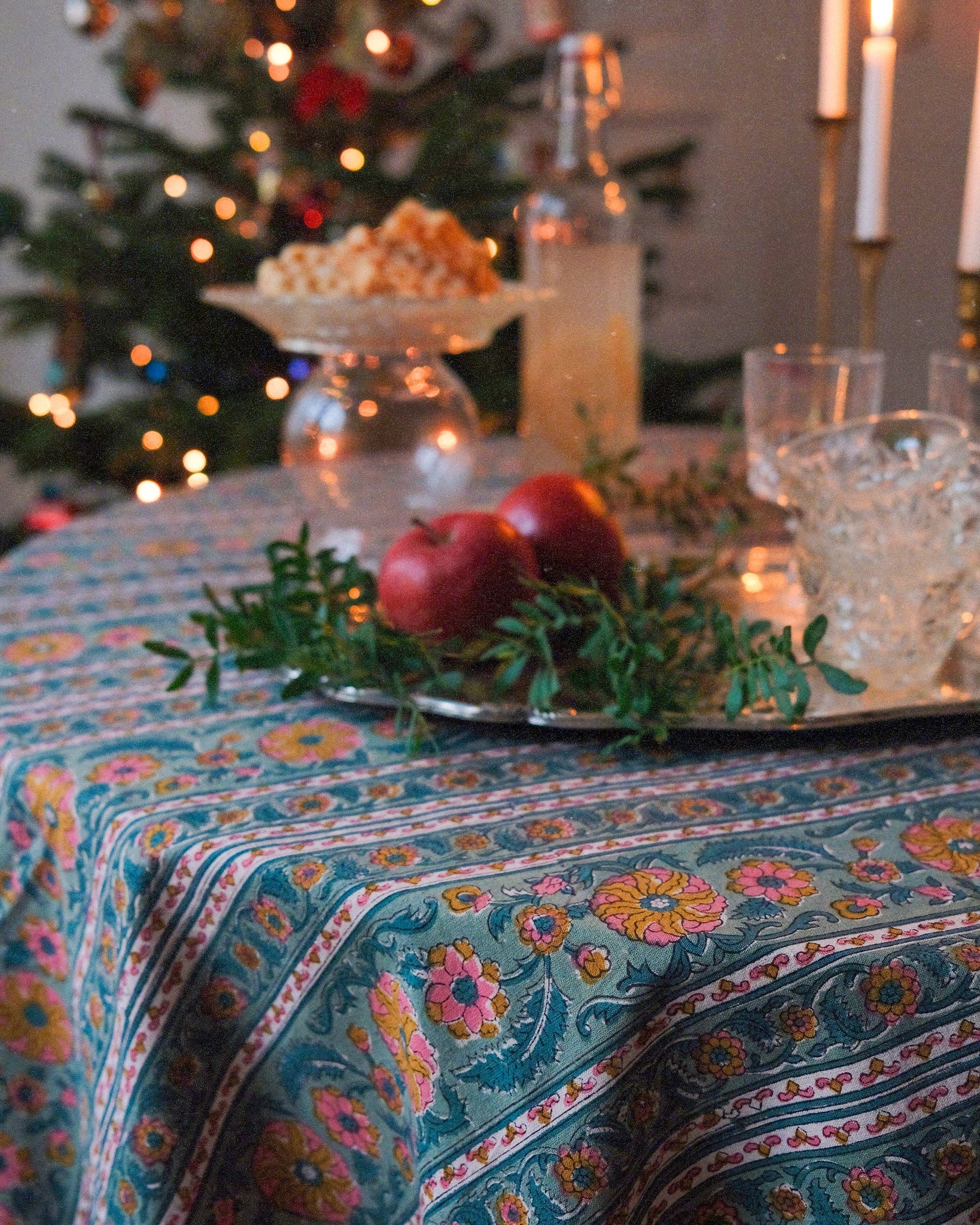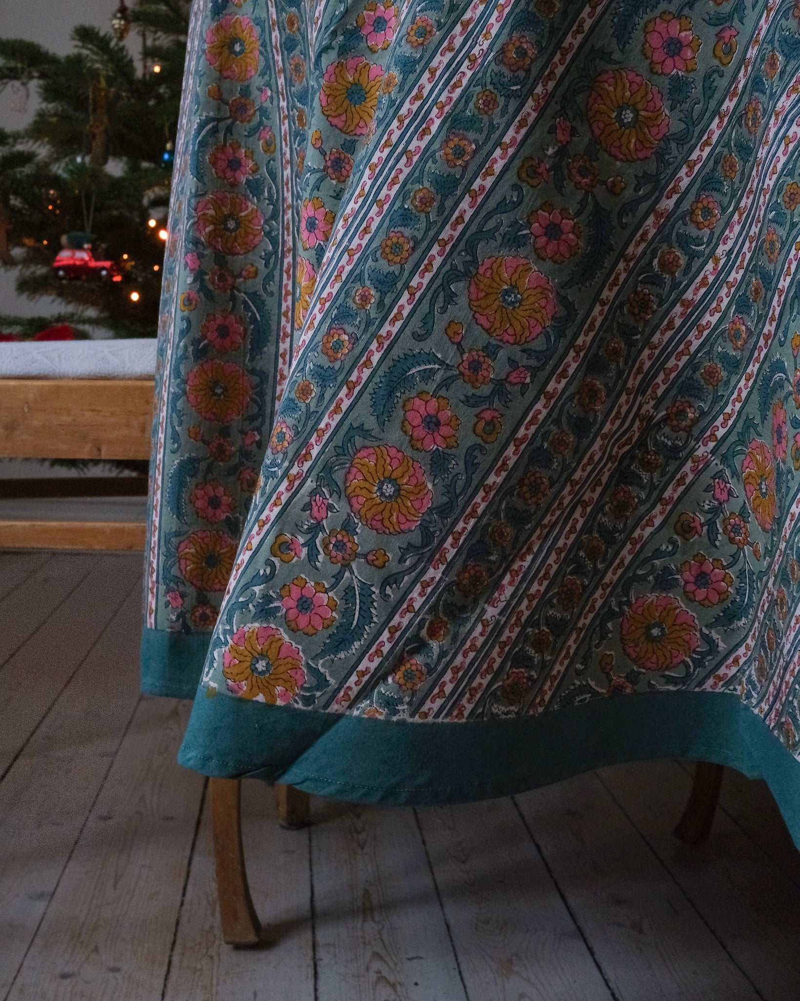 Duk med handtryckt mönster i grönt och rosa. Tillverkad i Jaipur, Indien.