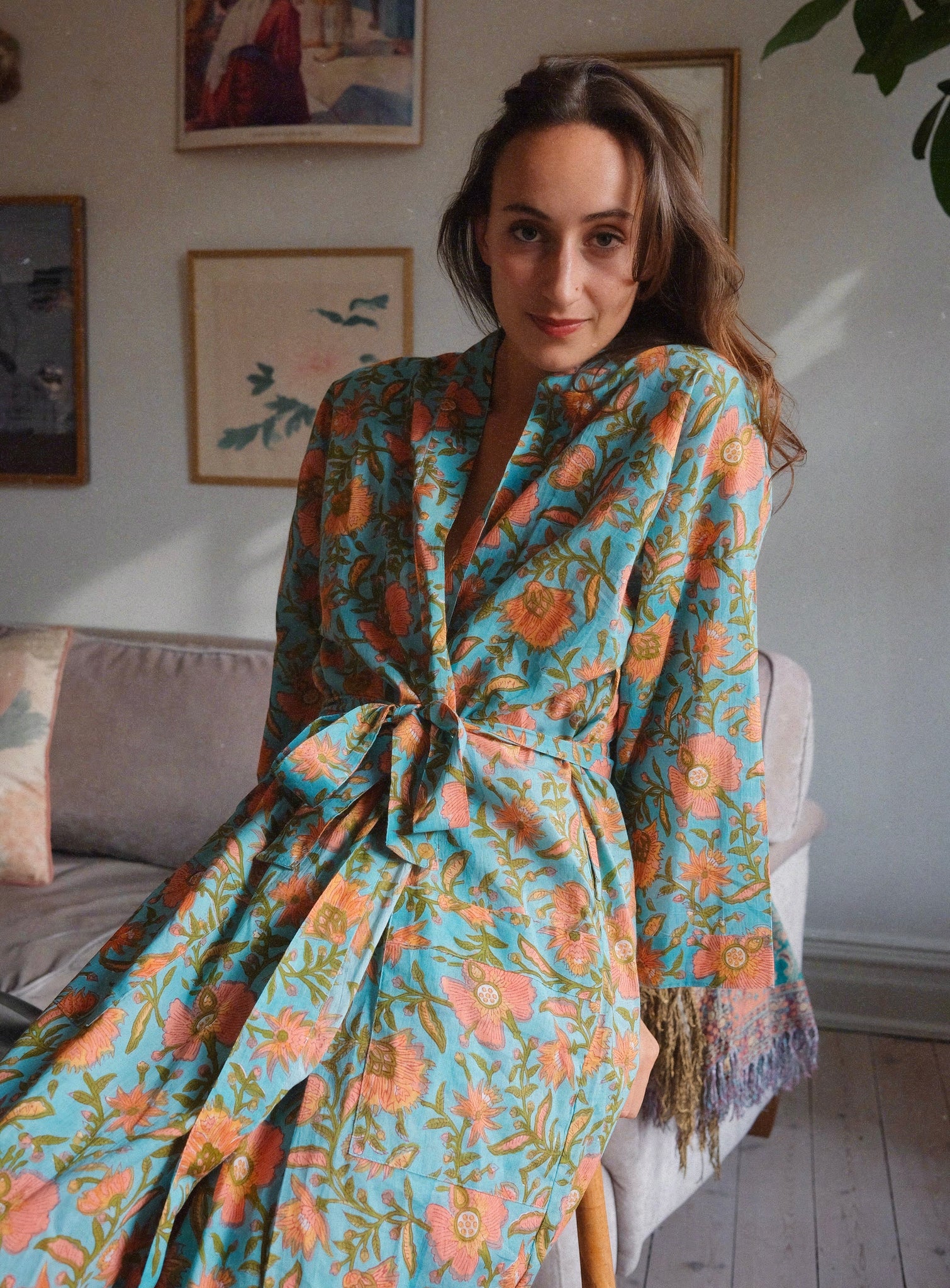 Med två fickor och skärp som hålls fast med två hankar i midjan.