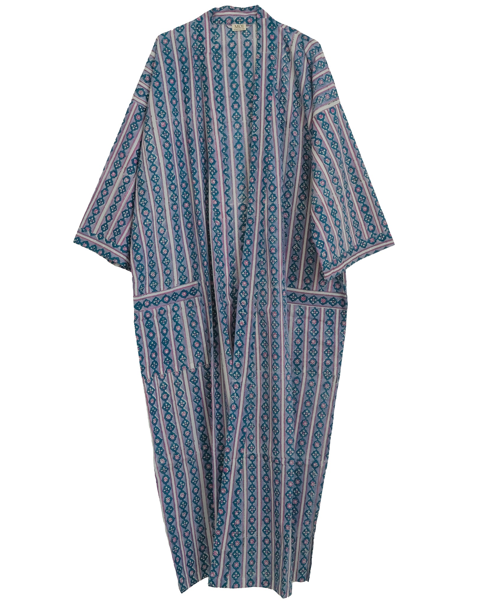 Morgonrock i handtryckt bomullstyg.