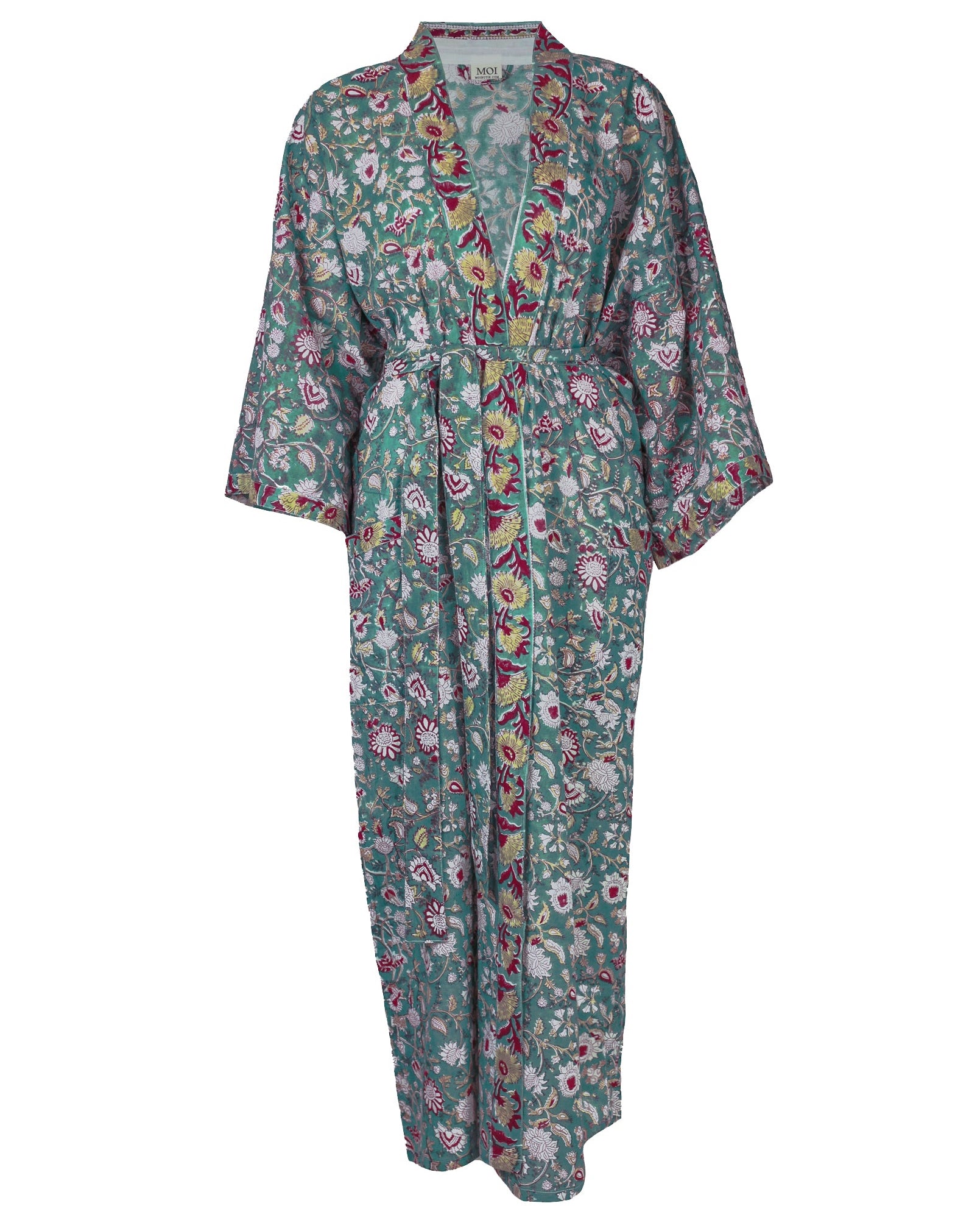 Morgonrock i handtryckt, mjukt bomullstyg med vid ärm.